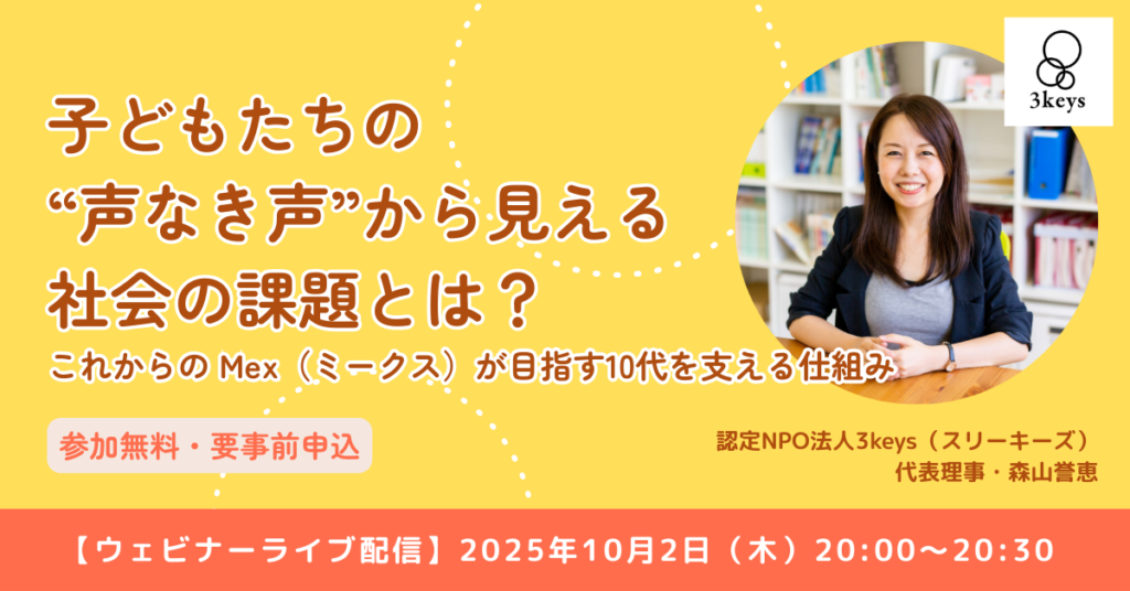 本ライブ配信では、Mexを利用する子どもたちの“声なき声”から見えてくる社会の課題について、当団体の代表・森山がお話しします。合わせて、活動を通して感じること、AI時代における情報アクセスの難しさ、3keysがこれから力を入れていきたいことなどについてもお伝えします。