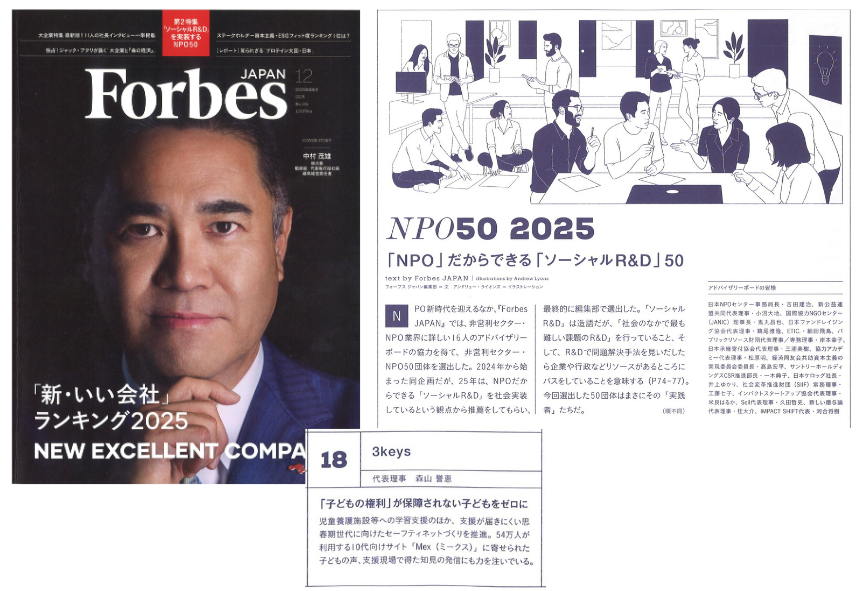 この度3keysは、『Forbes JAPAN』12月号の特別企画「NPO50 2025」にて、「『ソーシャルR&D』を実装するNPO50」の1団体として選出され、掲載されました。