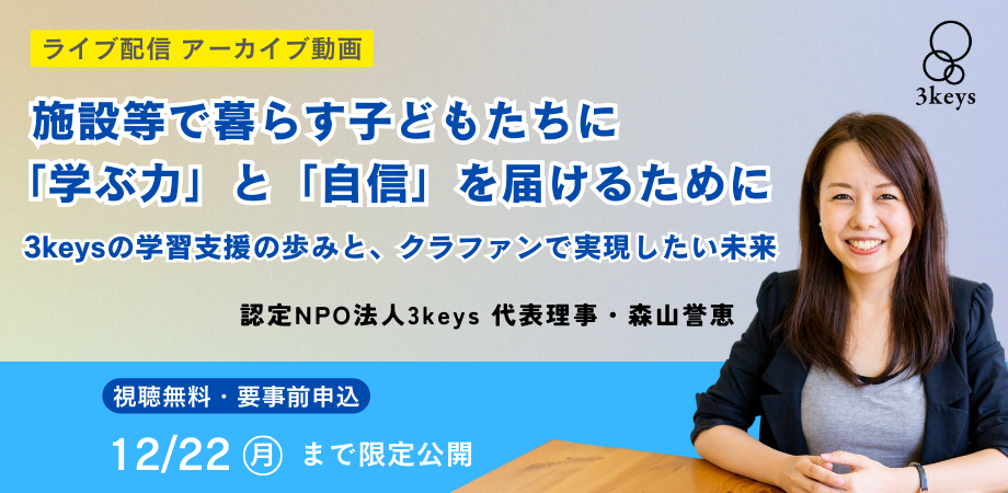 ぜひお気軽にご視聴いただき、児童養護施設等で暮らす子どもたちの状況や、支援の必要性、3keysの学習支援について知っていただけたら嬉しいです。そして、活動の意義を感じていただけましたら、ぜひクラウドファンディングへのご支援で応援をお願いいたします。
