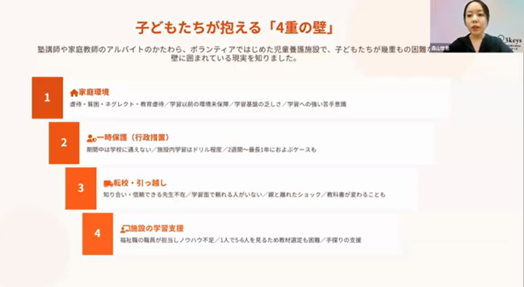 10年以上にわたり現場と向き合ってきた学習支援担当スタッフが、児童養護施設等で暮らす子どもたちが抱える“学習ハンデ”の実態と、それに対して3keysがどのような教材・サポートで支えてきたのかを、具体的な事例を交えてお伝えしています。